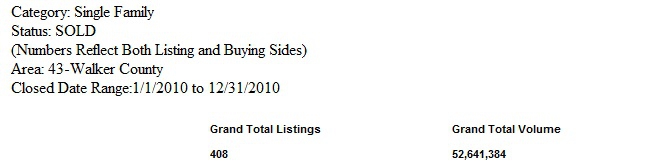 408 units sold in 2010--these are the Huntsville TX homes and greater Walker County Real Estate that sold in 2010