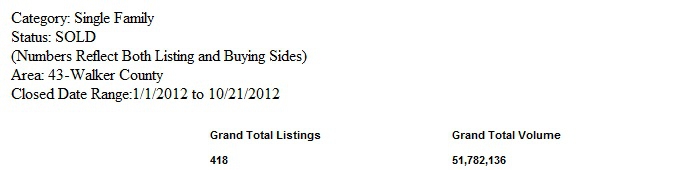 Of the $51,782,136 in single family home sales volume to date in 2012, Mari Montgomery Realty's Walker County single family home sales volume represents 11.35% or $5,875,595.